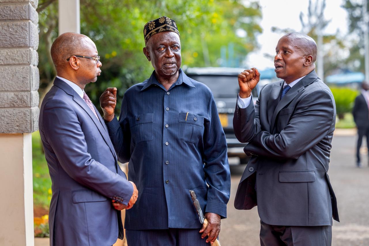 Deputy President Kithure Kindiki (r), Senator Oburu Odinga (c) and Senate Speaker Amason Kingi at JKIA as they wait for the arrival of the body of the late Raila Odinga on October 16, 2025.PHOTO/PCS
