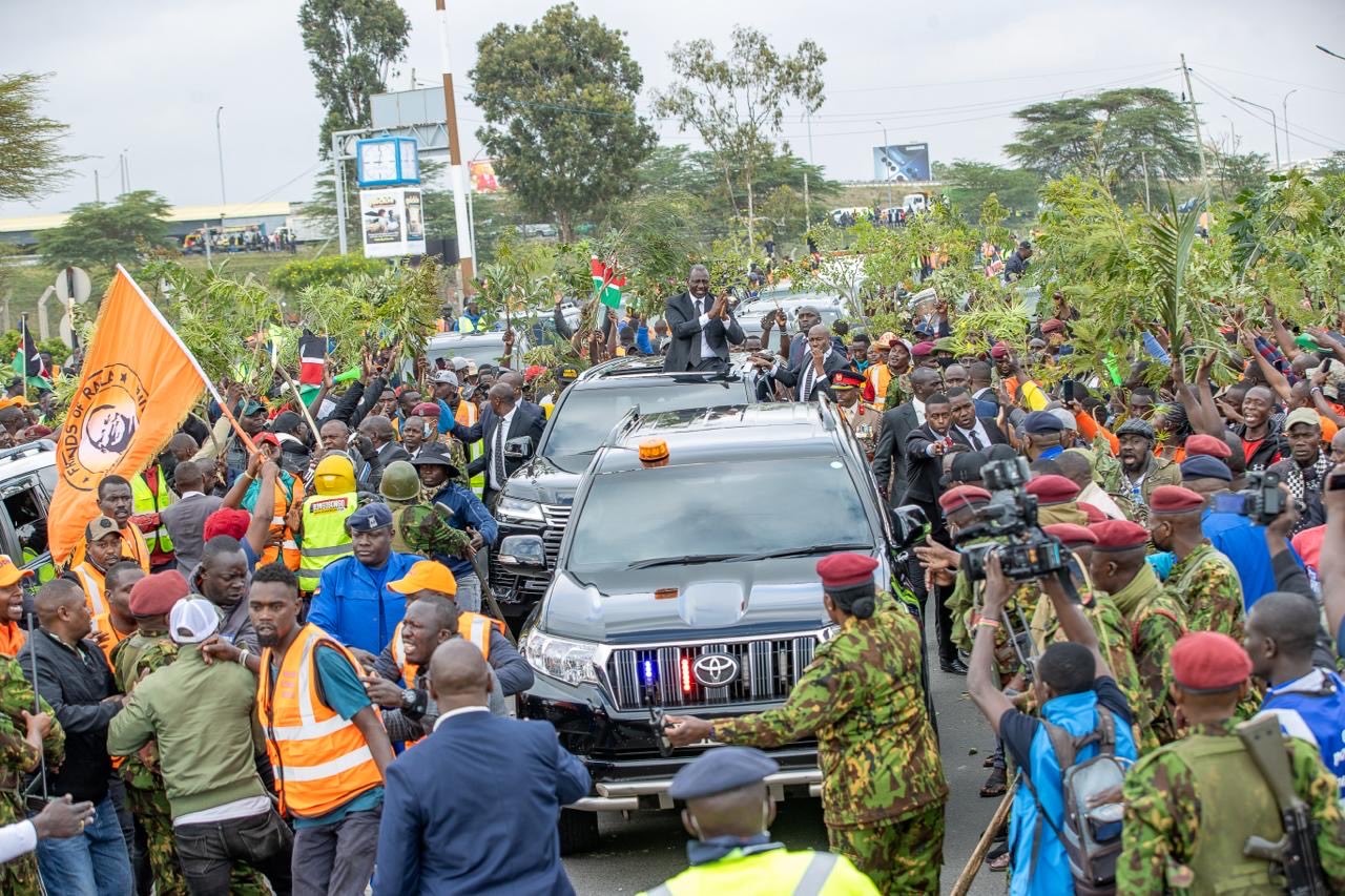 President William Ruto arriving at Kasarani for the public viewing of the body of the late Prime Minister Raila Odinga at JKIA on October 16, 2025.PHOTO/PCS