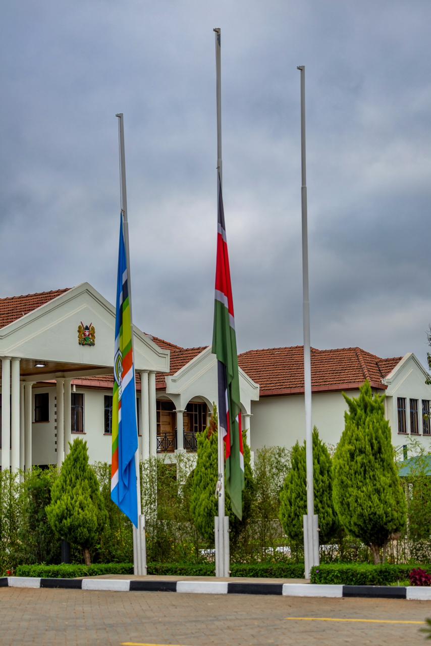 Flags at half-mast at the residence of the Deputy President Kithure Kindiki, Nairobi in honor of the former Prime Minister Raila Odinga on October 16, 2025.PHOTO/PCS