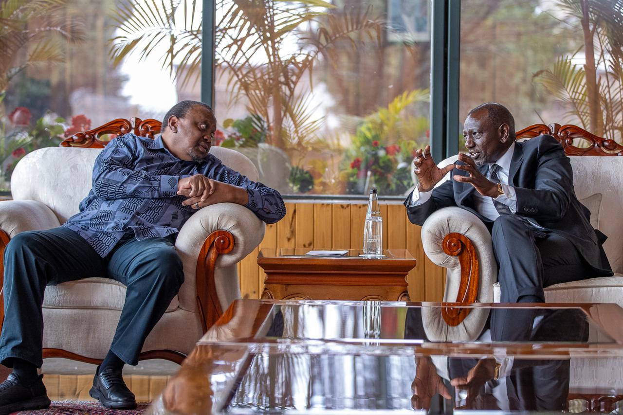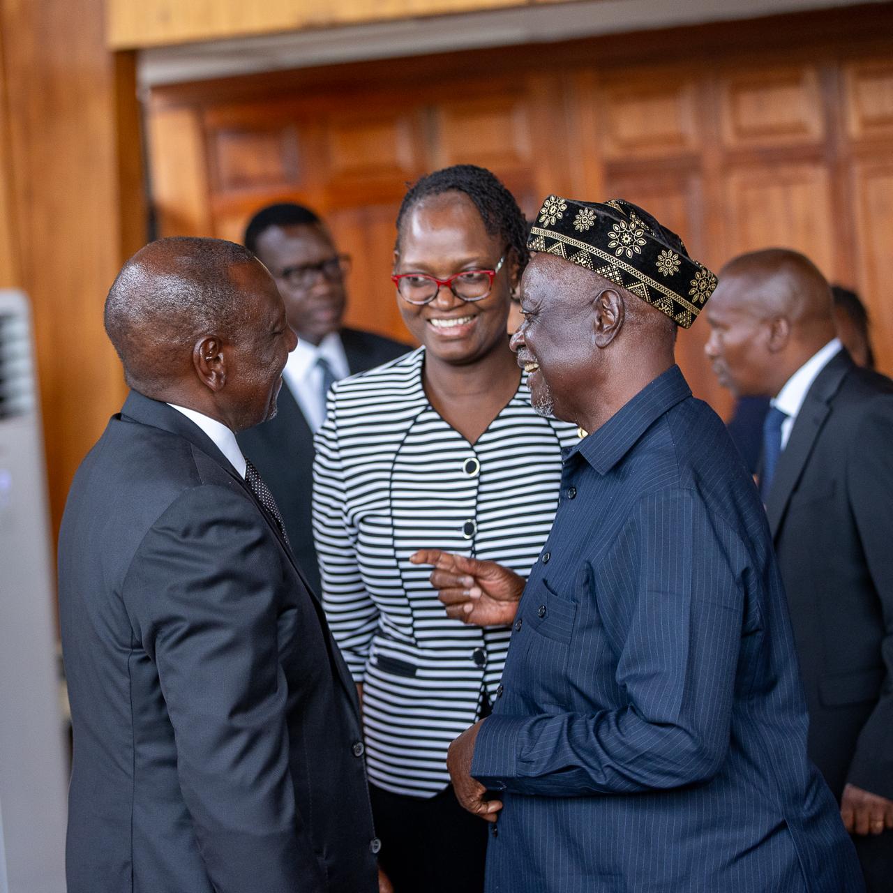 President William Ruto speaks with former President William Ruto at JKIA as they wait for the arrival of the body of the late Raila Odinga on October 16, 2025.PHOTO/PCS