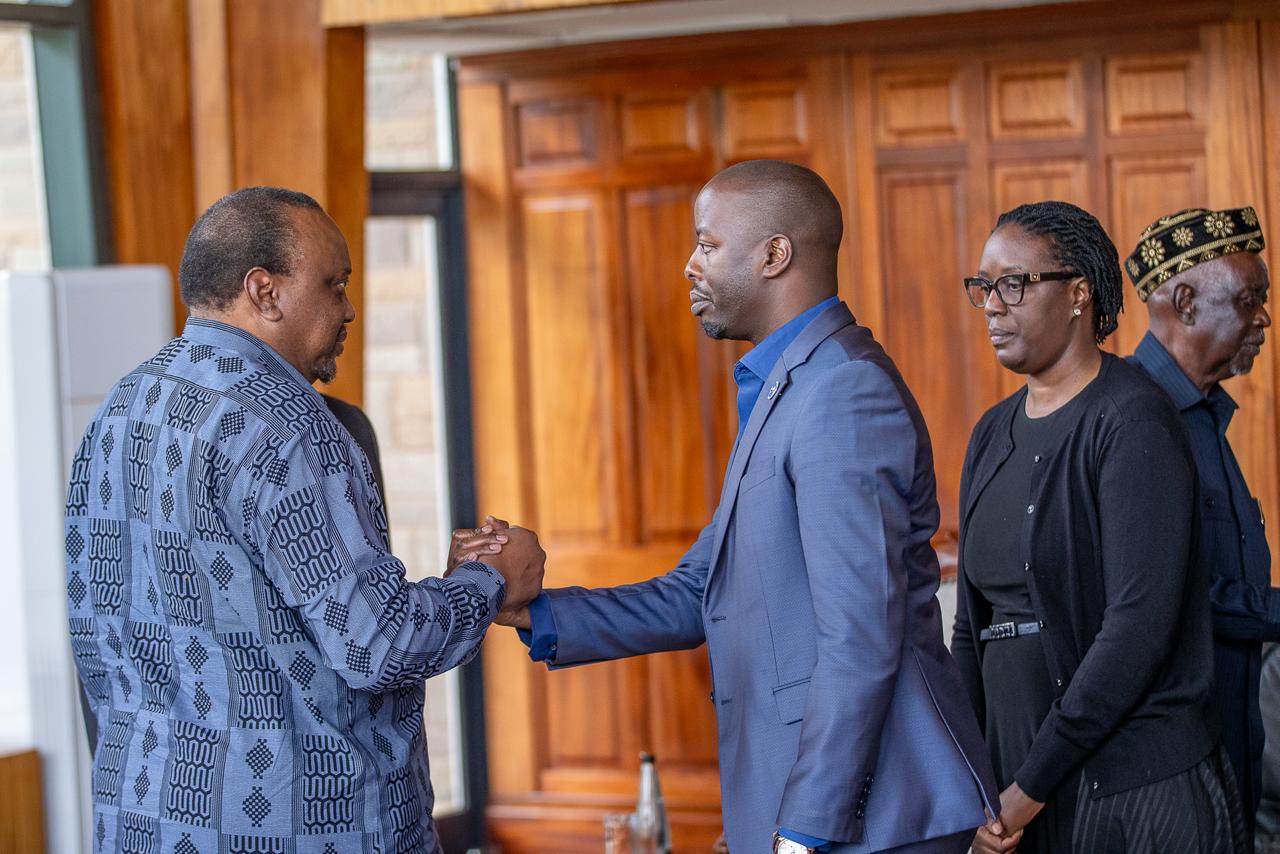 Former President Uhuru Kenyatta greeting Raila Junior at JKIA as they wait for the arrival of the body of the late Raila Odinga on October 16, 2025.PHOTO/PCS