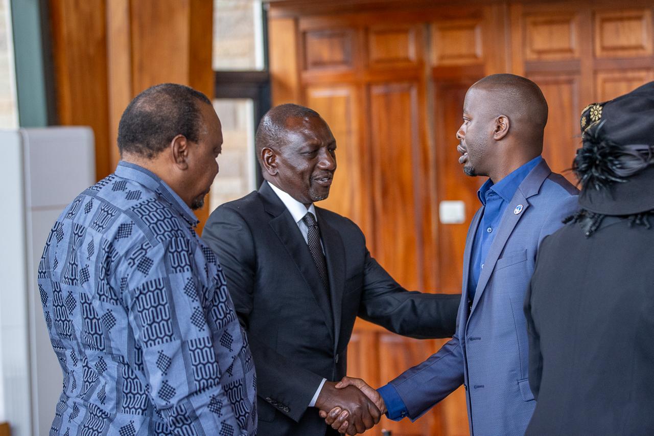 President William Ruto, Former President Uhuru Kenyatta greeting Raila Junior at JKIA as they wait for the arrival of the body of the late Raila Odinga on October 16, 2025.PHOTO/PCS