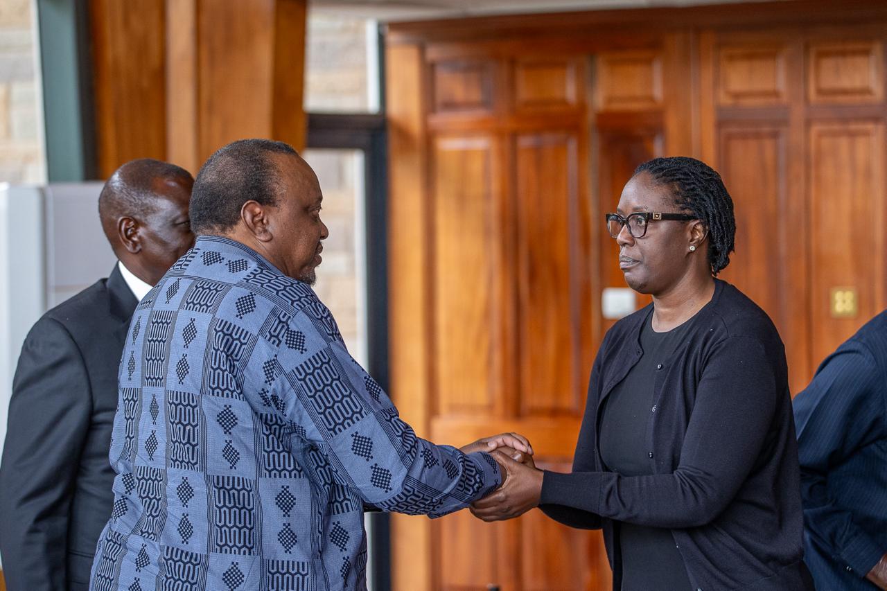 Former President Uhuru Kenyatta greeting Rosemary Odinga at JKIA as they wait for the arrival of the body of the late Raila Odinga on October 16, 2025.PHOTO/PCS