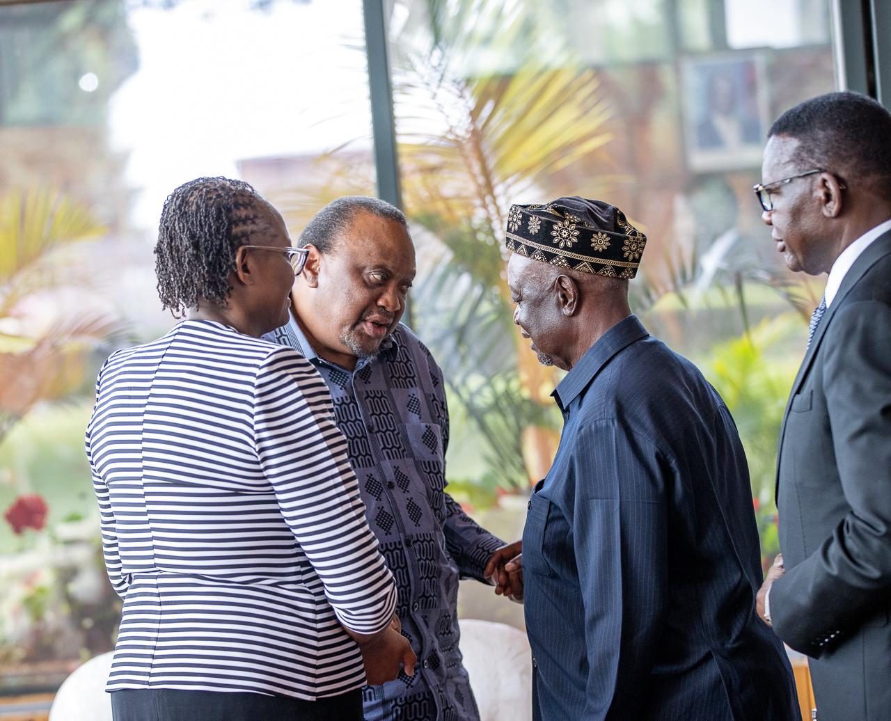 Former President Uhuru Kenyatta having a talk with Senator Oburu Oginga and his sister at JKIA as they wait for the arrival of the body of the late Raila Odinga on October 16, 2025.PHOTO/PCS