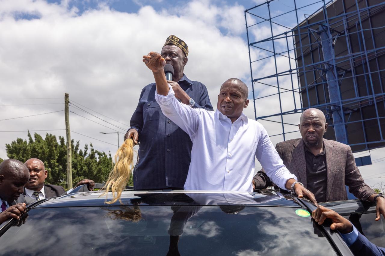 Deputy, Kithure Kindiki and Siaya Senator Oburu Oginga addressing mourners along Mombasa Road after the arrival of the body of the late Raila Odinga on October 16, 2025.PHOTO/PCS