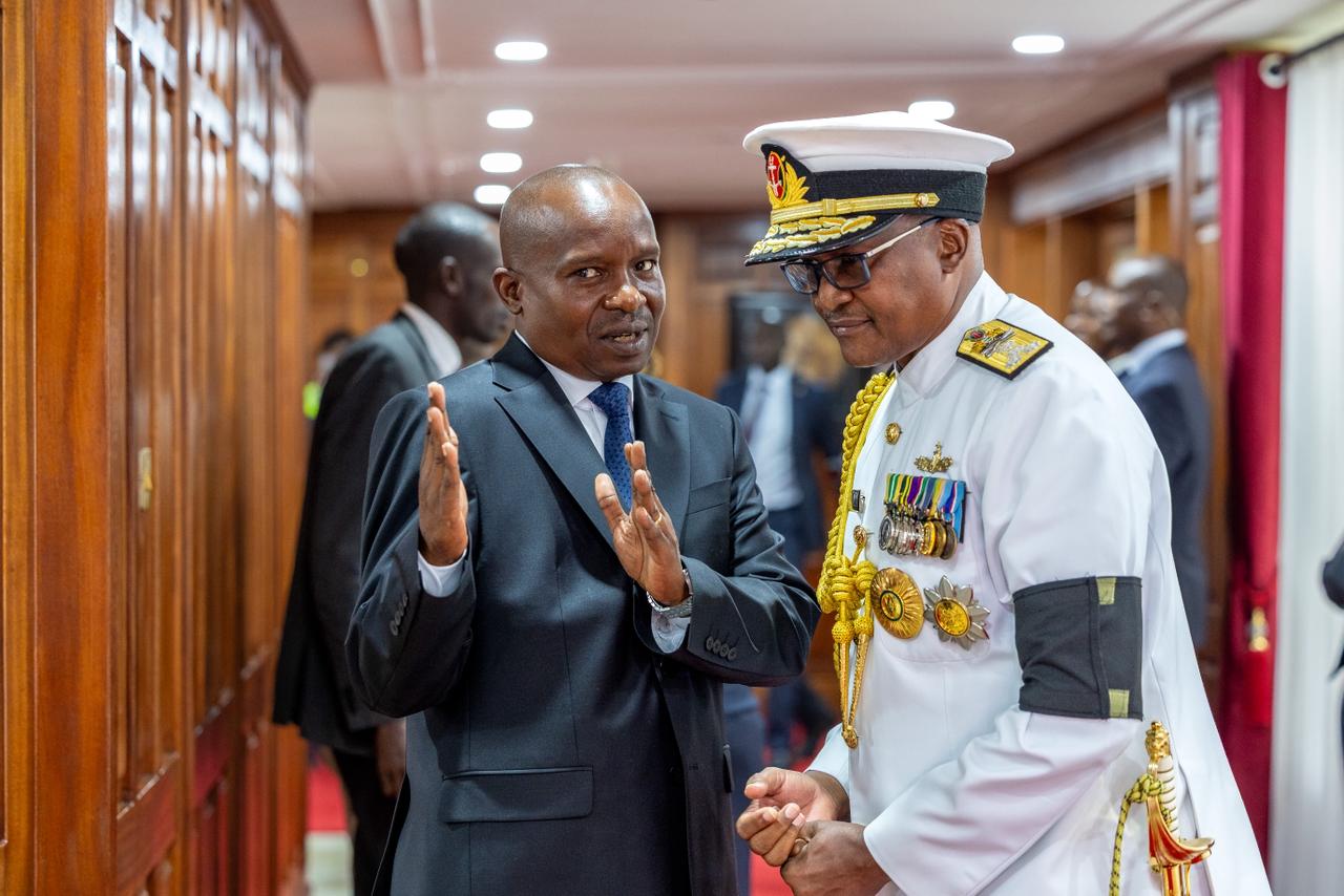 Deputy President, Kithure Kindiki and Chief of the Defence Forces (CDF), General Charles Kahariri at JKIA as they wait for the arrival of the body of the late Raila Odinga on October 16, 2025.PHOTO/PCS
