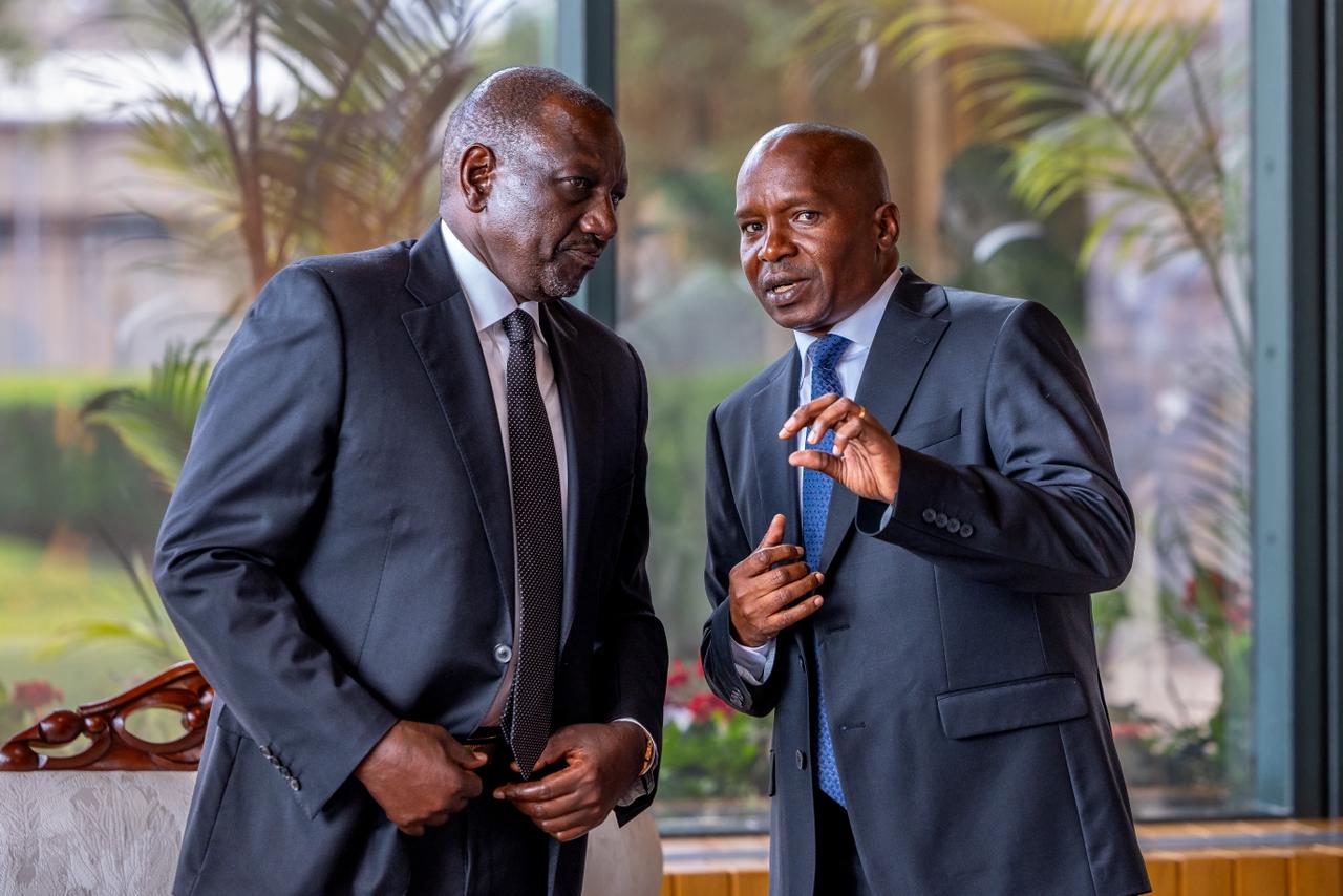 President William Ruto speaks with his Deputy, Kithure Kindiki, at JKIA as they wait for the arrival of the body of the late Raila Odinga on October 16, 2025.PHOTO/PCS