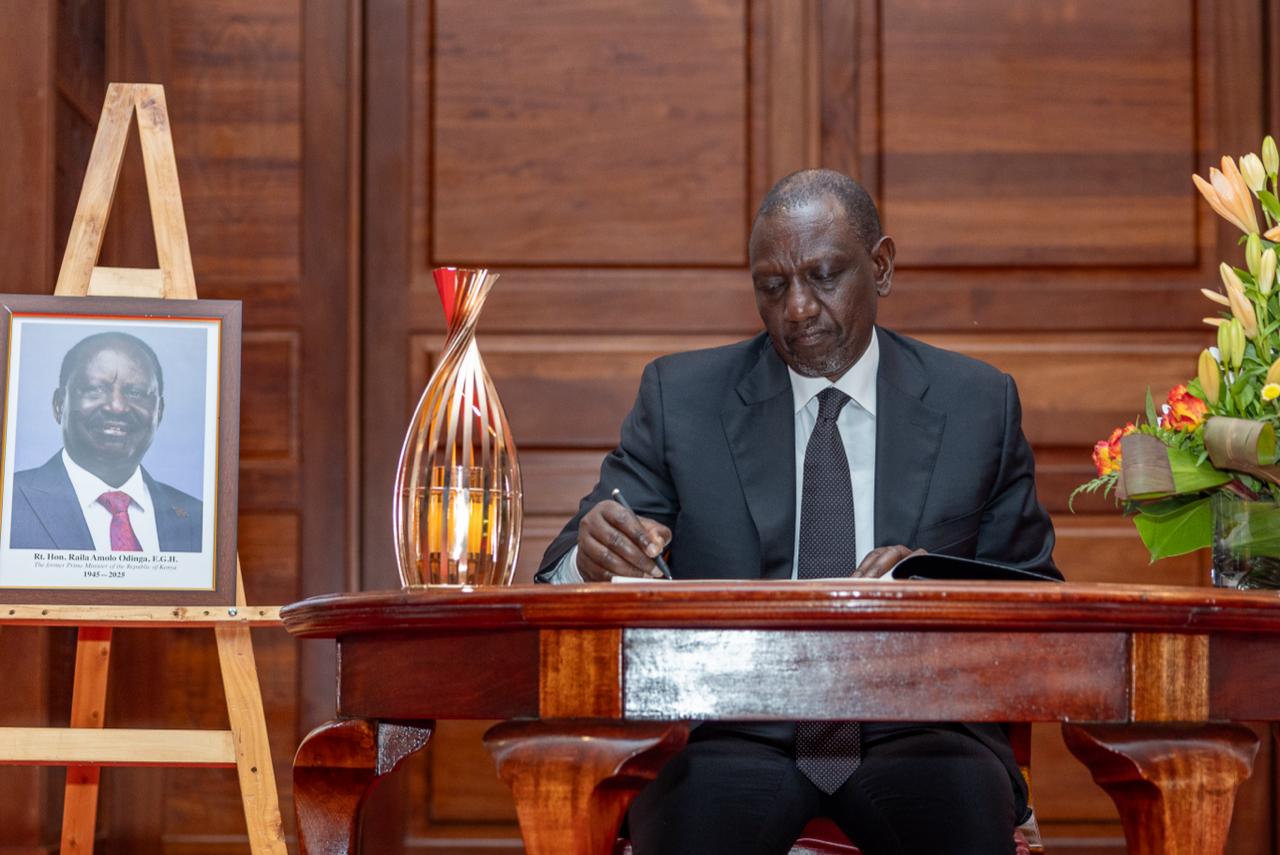 President William Ruto writing a tribute of the late former Prime Minister Raila Odinga at Parliament Buildings on October 17, 2025. PHOTOS/PCS