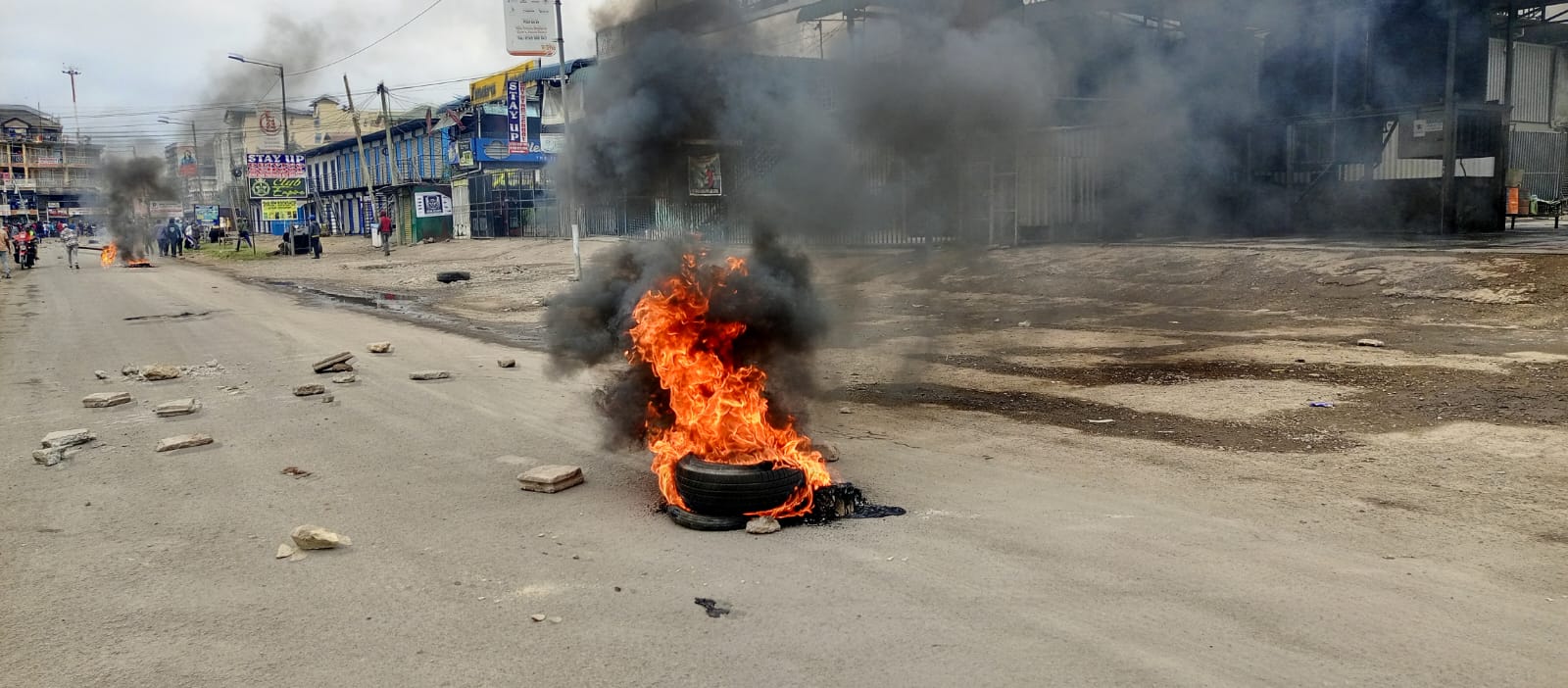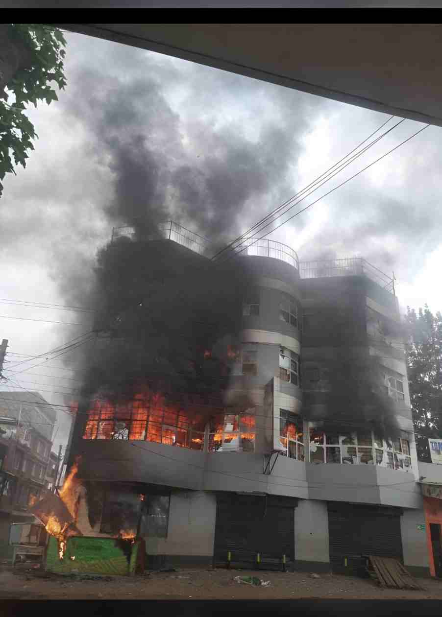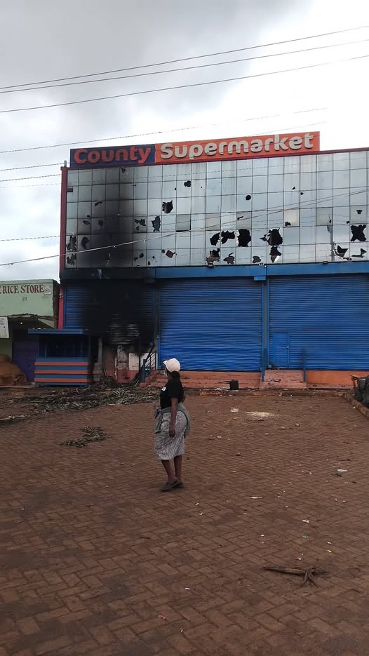 The group, which lit bonfires on Monday morning, first stormed a mobile phone shop and looted it before targeting a nearby supermarket.